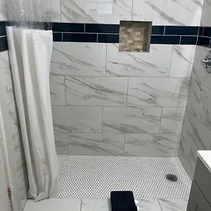 Guests can use a bathtub and a shower together with towels.