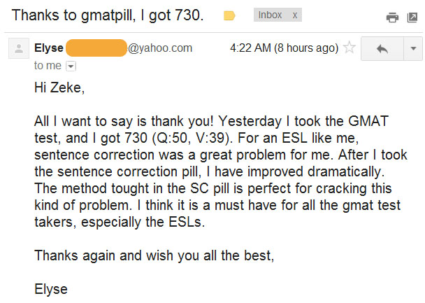 As she says, “For an ESL like me, sentence correction was a great problem for me. After I took the sentence correction pill, I have improved dramatically. The method taught in the SC Pill is perfect for cracking this kind of problem. I think it is a must have for all the GMAT test takers, especially the ESLs.”