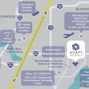 The smoke-free property has an unbeatable location within 1.1 km of Crayola Experience, while shopping venues like Twin Cities Premium Outlets are 10 minutes' drive away. The Hyatt Regency Bloomington - Minneapolis is located quite close to Nickelodeon Universe Amusement Park in Bloomington.