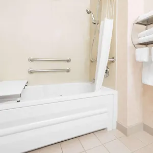 The private bathrooms have a bathtub and a roll in shower, and comforts such as a hair dryer.
