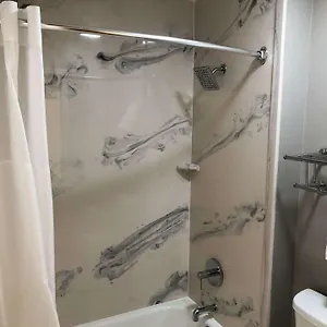 Guests can use a bathtub and a roll in shower together with towels.