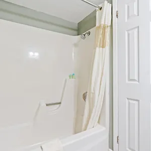 Guests can use a tub and a shower together with towels.