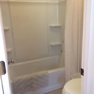 Bathrooms have a bathtub together with towels.
